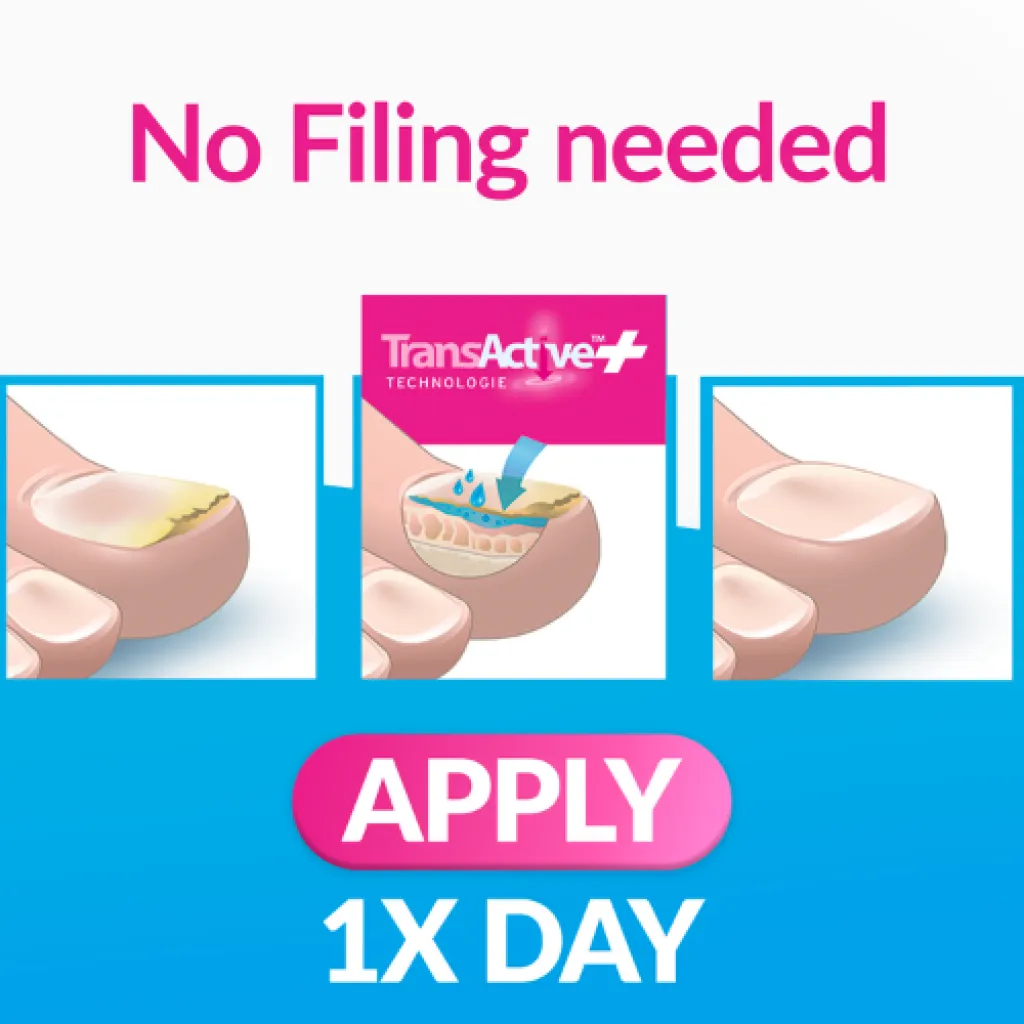 - 24-timmars ocklusiv film med långsam frisättning för djup penetration i förtjockade, deformerade naglar.